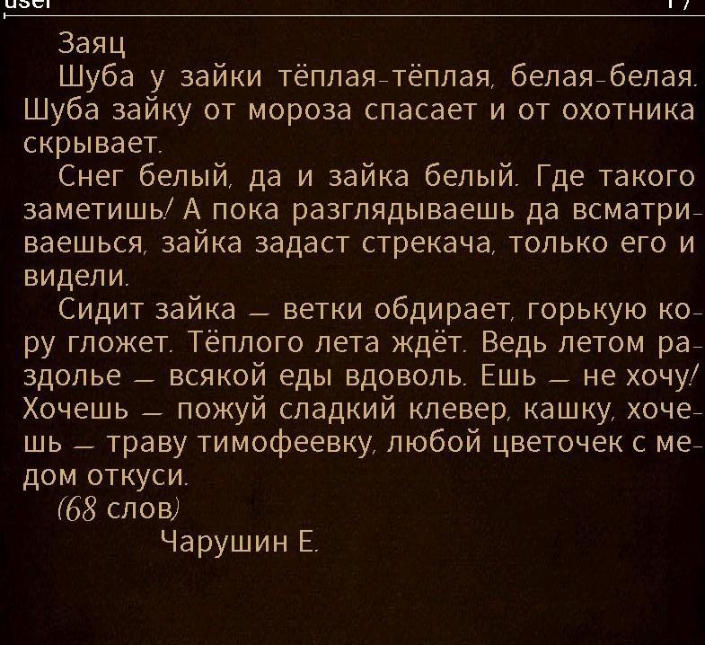 Сидить зайчик - гілки обдерти, гірку кору глине. На теплого літа чекає. Адже влітку роздолля-всякої їжі вздовж. Їж-не хочу! Хочеш – пожуй солодку конюшину, кашу, хочеш – траву тимофіївку, будь-яку квіточку з медом відкуси.