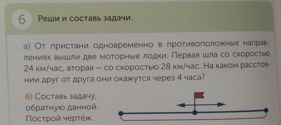 а) От пристани одновременно в противоположных направлениях вышли две моторные лодки. Первая шла со скоростью 24 км/час, вторая со скоростью 28 км/час. На каком расстоянии друг от друга они окажутся через 4 часа?