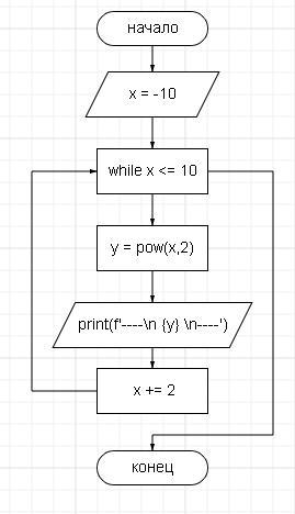 Вывести таблицу значений функции у = х². Диапазон изменения от -10 до 10, шаг равен 2.