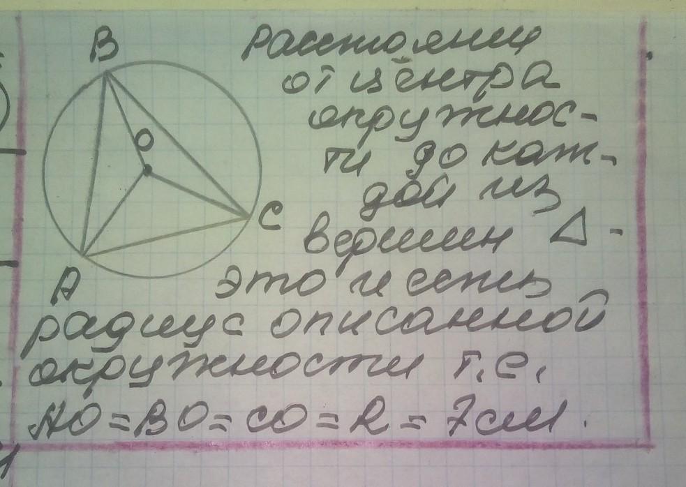 Коло радіусом 7 см описане навколо трикутника. Чому дорівнює відстань від центра кола до кожної з вершин трикутника?