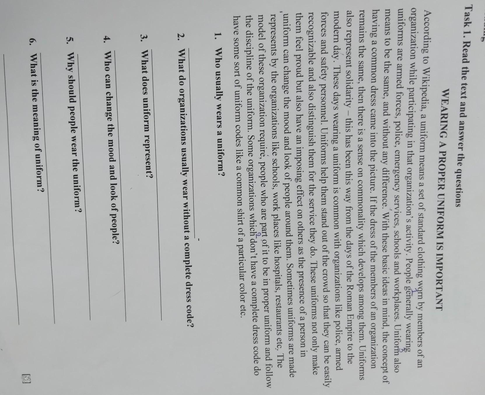 1. Who usually wears a uniform? 2. What do organizations usually wear without a complete dress code? 3. What does uniform represent? 4. Who can change the mood and look of people? 5. Why should people wear the uniform? 6. What is the meaning of uniform?