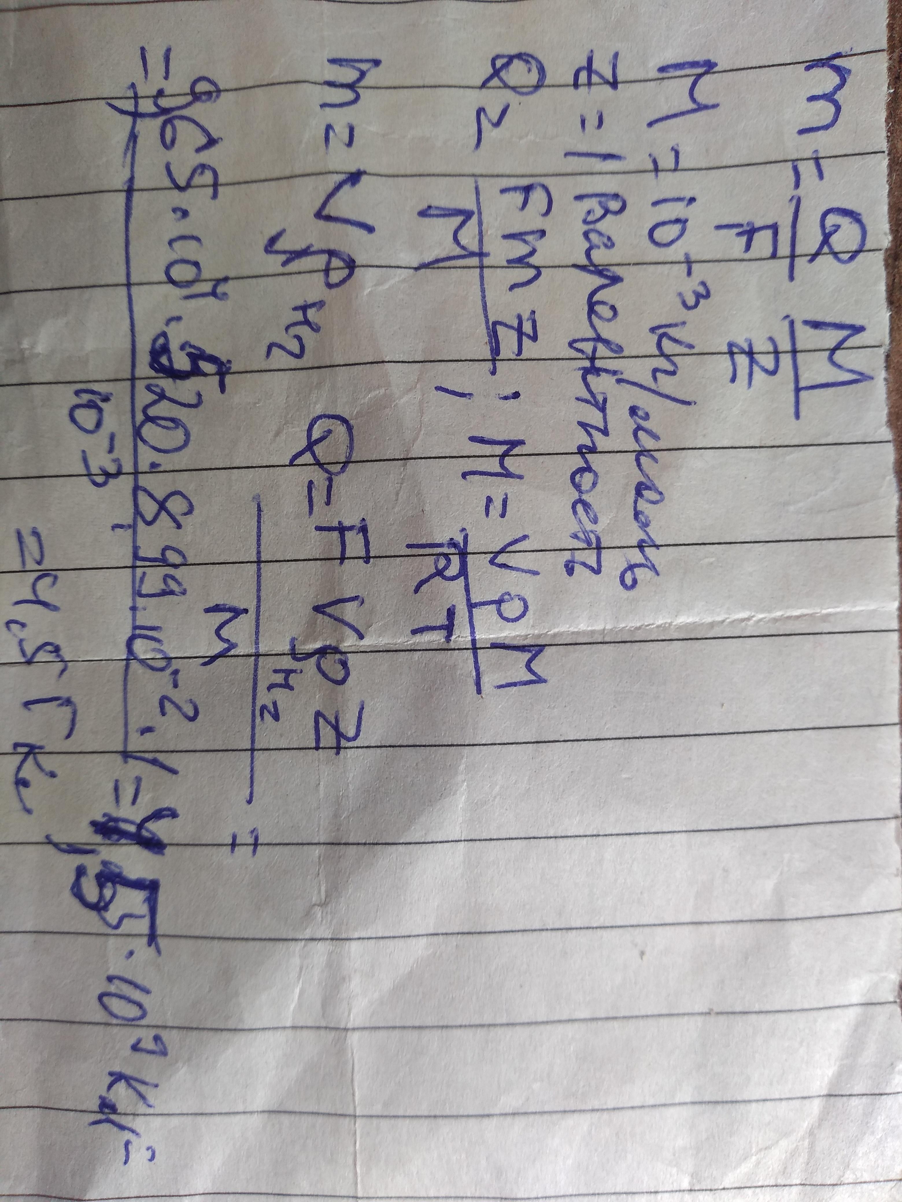 Визначте заряд, який потрібно пропустити через водний розчин кислоти, щоб отримати кількість водню, якою можна було б заповнити аеростат об'ємом 520 м^3. Густина водню 0,09 кг/м^3. Відповідь подайте у гігакулонах
