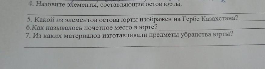 Задание №12. Дайте ответы на следующие вопросы. 1. Yro takoe topra? Jegma-omo embrie gou hazasedbe 2. В чем особенности казахского национального жилища? Зошо ні, мало. Адиал, или даже 3. Назовите основные материалы, служащие ДЛЯ изготовления ш, шку. юрты В гол ашша таллаз, тоду 4. Назовите элементы, составляющие остов юрты. 5. Какой из элементов остова юрты изображен на Гербе Казахстана? 6.Как называлось почетное место в юрте? 7. Из каких материалов изготавливали предметы убранства юрты?