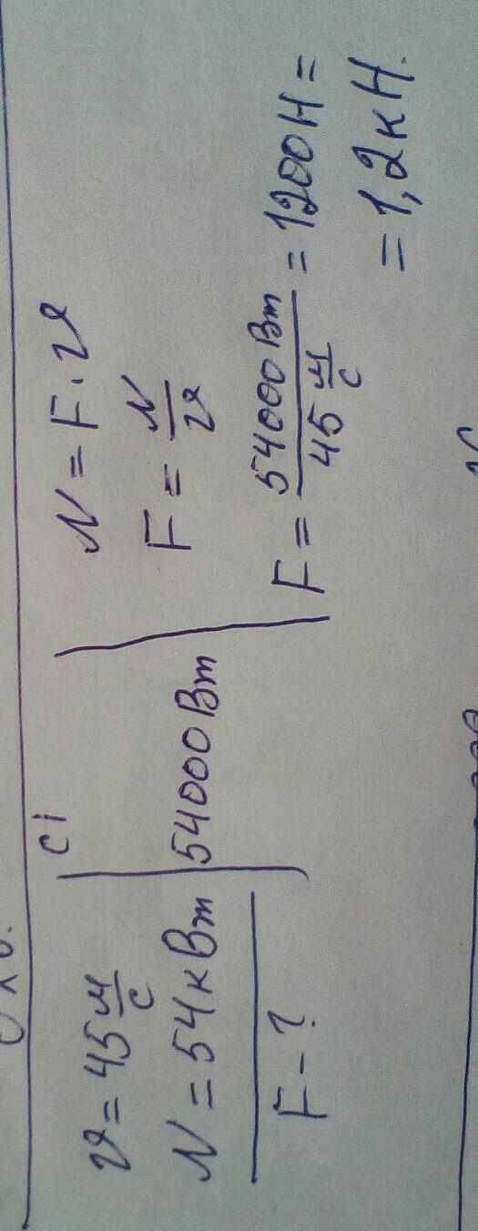 Якою є сила тяги одного з серійних мотоциклів, якщо він, рухаючись зі швидкістю 45 м/с, розвиває потужність 54 кВт? Отриманий результат подайте в кілоньютонах.