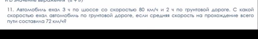 автомобиль ехал 2 часа со скоростью 80 км/ч и 2 часа по грунтовой дороге. с какой скоростью ехал автомобиль, если средняя скорость на протяжении всего пути составила 72 км/ч? ПОМОГИТЕ ПОЖАЛУЙСТА