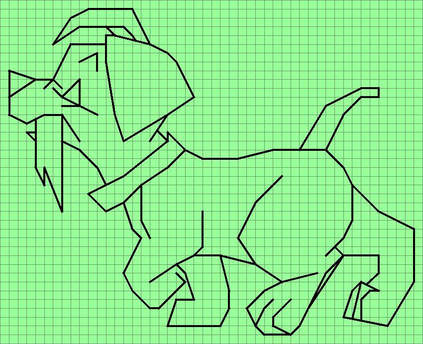Полученный на выходе алгоритм, рисующий эту собачку находится в первом текстовом файле, приложенным под этим ответом (он слишком длинный, поэтому напрямую в это решение не вошёл). Откройте текстовый файл, там всё будет в одну строку, но если скопировать всё вместе и вставить в Кумир, то появятся переносы строк.