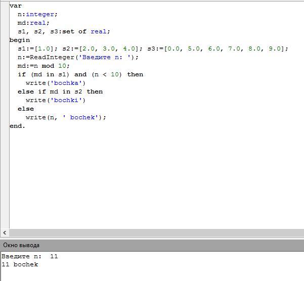 Напишите программу Мобильный телефон Василия поддерживает только транслит поэтому он передаёт вида N Bochek Например 3 bochki или 1 bochka.напишите программу которая выбирает правильное слово из bochka bochki bochek в зависимости от N (Паскаль)