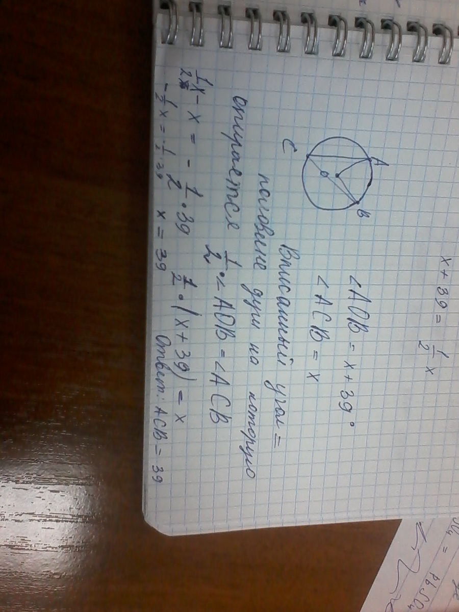 Найдите центральный угол АОВ , если он на 39° больше вписанного угла АСВ , опиращегося на ту же дугу