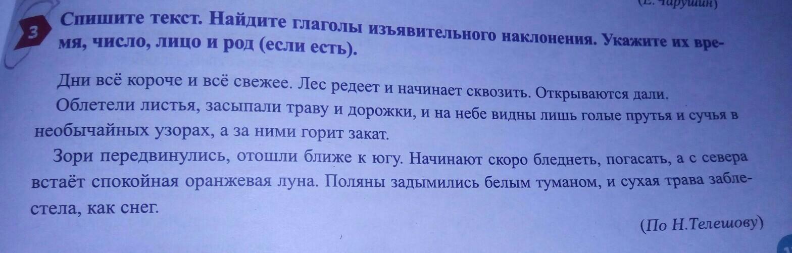 Спишите текст. Найдите глаголы изъявительного наклонения. Укажите их вре- 3 мя, число, лицо и род (если есть). Дни всё короче и всё свежее. Лес редеет и начинает сквозить. Открываются дали. Облетели листья, засыпали траву и дорожки, и на небе видны лишь голые прутья и сучья в необычайных узорах, а за ними горит закат. Зори передвинулись, отошли ближе к югу. Начинают скоро бледнеть, погасать, а с севера встаёт спокойная оранжевая луна. Поляны задымились белым туманом, и сухая трава забле- стела, как снег. (По Н.Телешову