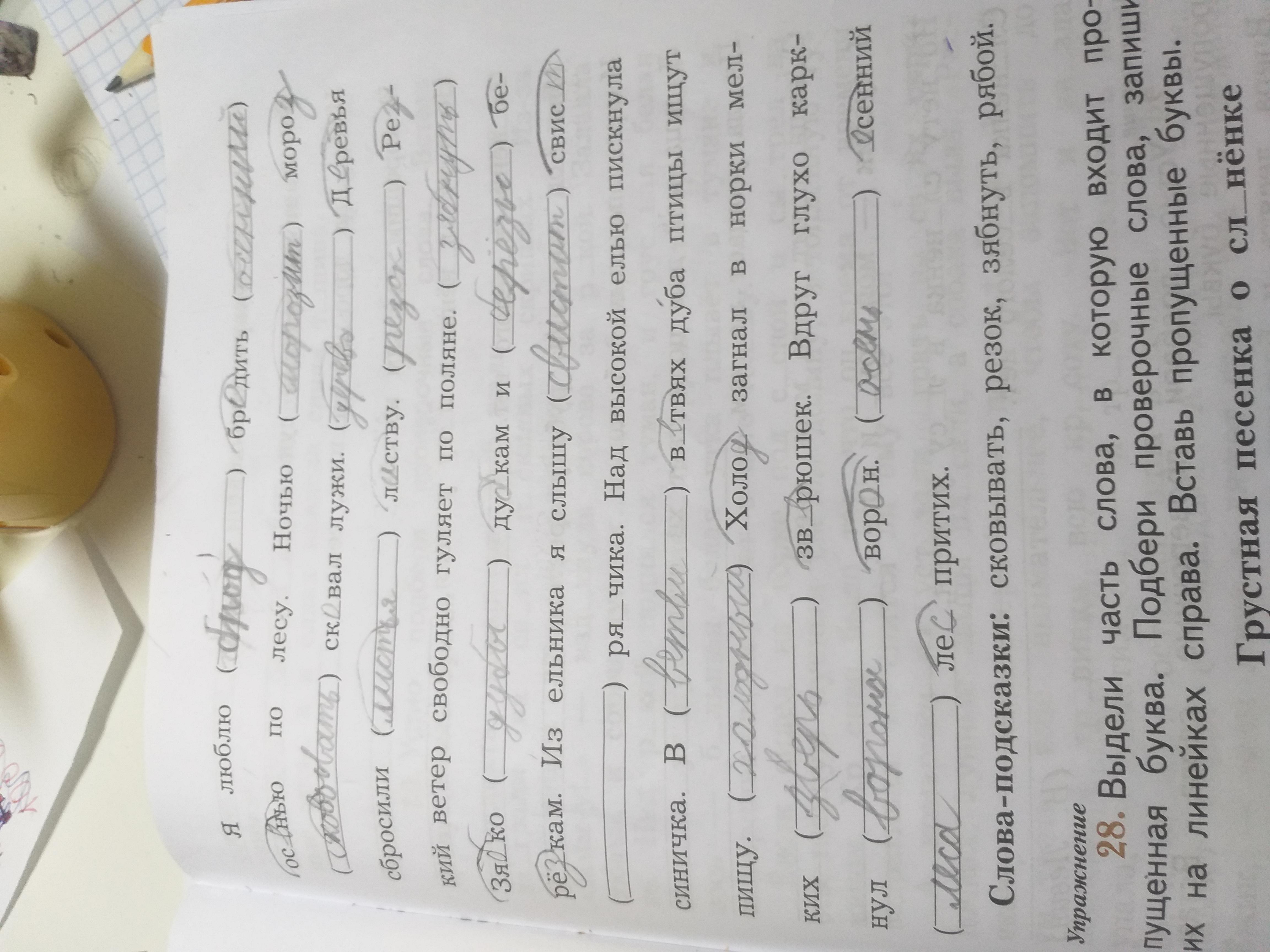 Я люблю (брод) бродить (осенний) осенью по лесу. Ночью (морозит) мороз (сковывать) сковал лужи. (дерево) Деревья сбросили (листья) листву. (резок) Резкий ветер свободно гуляет по поляне. (зябнуть) Зябко (дубы) дубкам и (берёзы) берёзкам. Из ельника я слышу (свистит) свист (рябой) рябчика. Над высокой елью пискнула синичка. В (ветви) ветвях дуба птицы ищут пищу. (холодный) Холод загнал в норки мелких (зверь) зверюшек. Вдруг глухо каркнул (ворона) ворон. (осень) Осенний (леса) лес притих.
