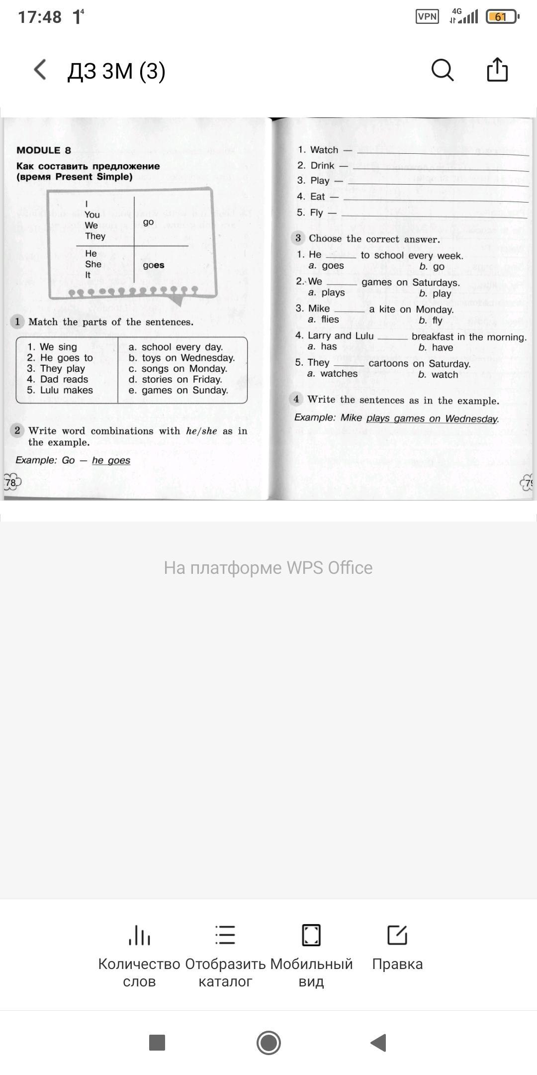 1)1c,2- a,3-e,4-d,5-b. 3) goes,play,flies ,have,watch