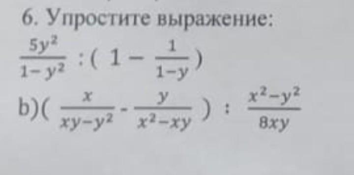 6. Упростите выражение: (5y ^ 2)/(1 - y ^ 2) / (1 - 1/(1 - y)) b)( x xy-y^ 2 - y x^ 2 -xy ): x^ 2 -y^ 2 8xy