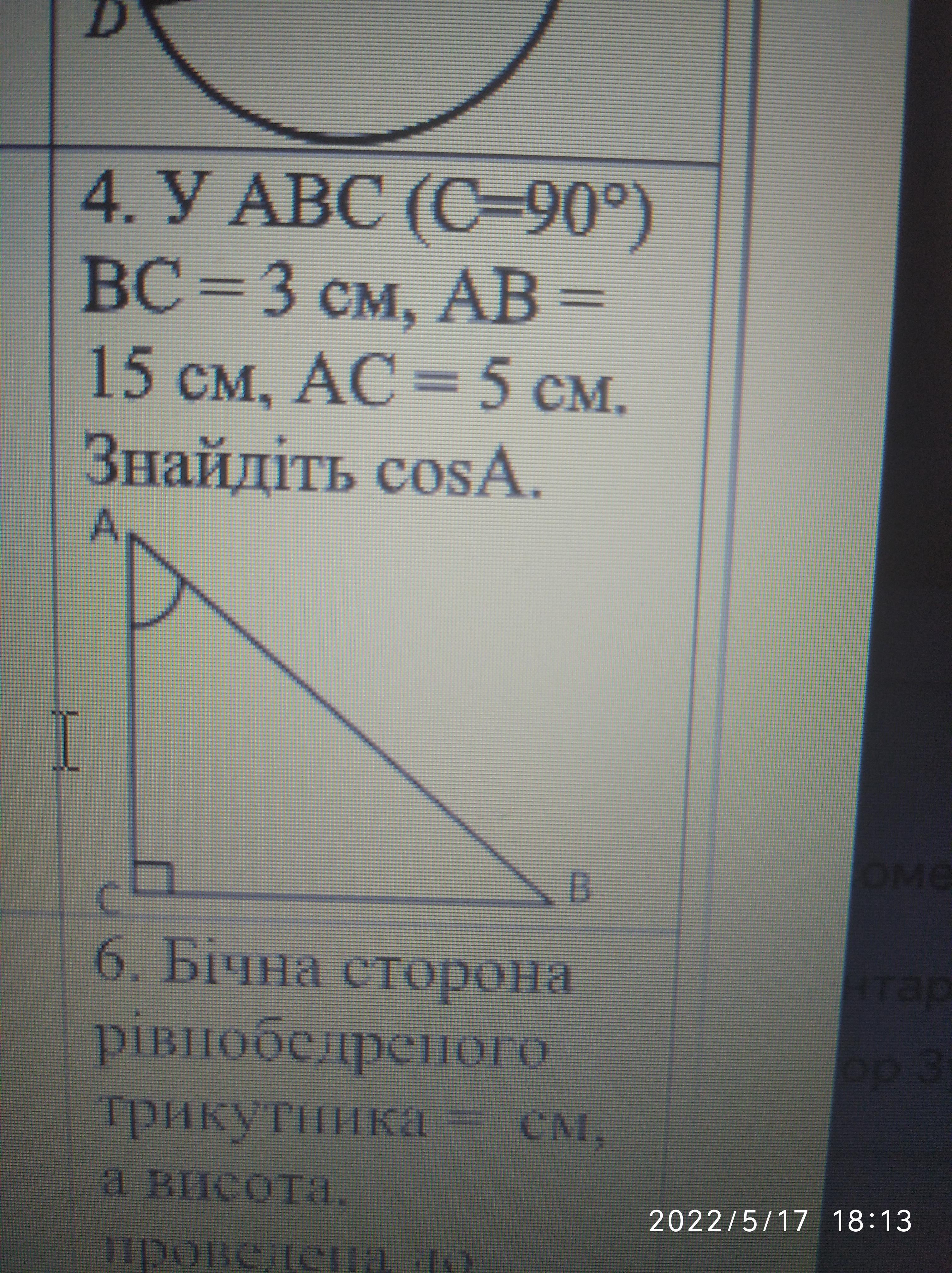 cosA=AC/AB=5/15=1/3