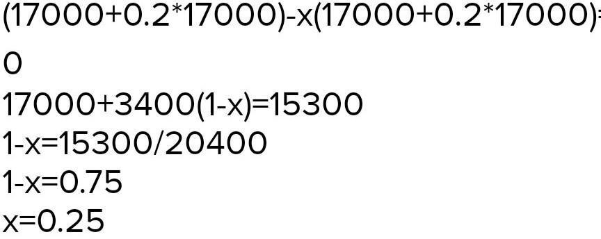 так так 20% это 0,2 в десятичной дроби 17000*0,2 и плюс 17000 и будет 3400+17000 и получится 200400.но 200400 нужно отнять 15300