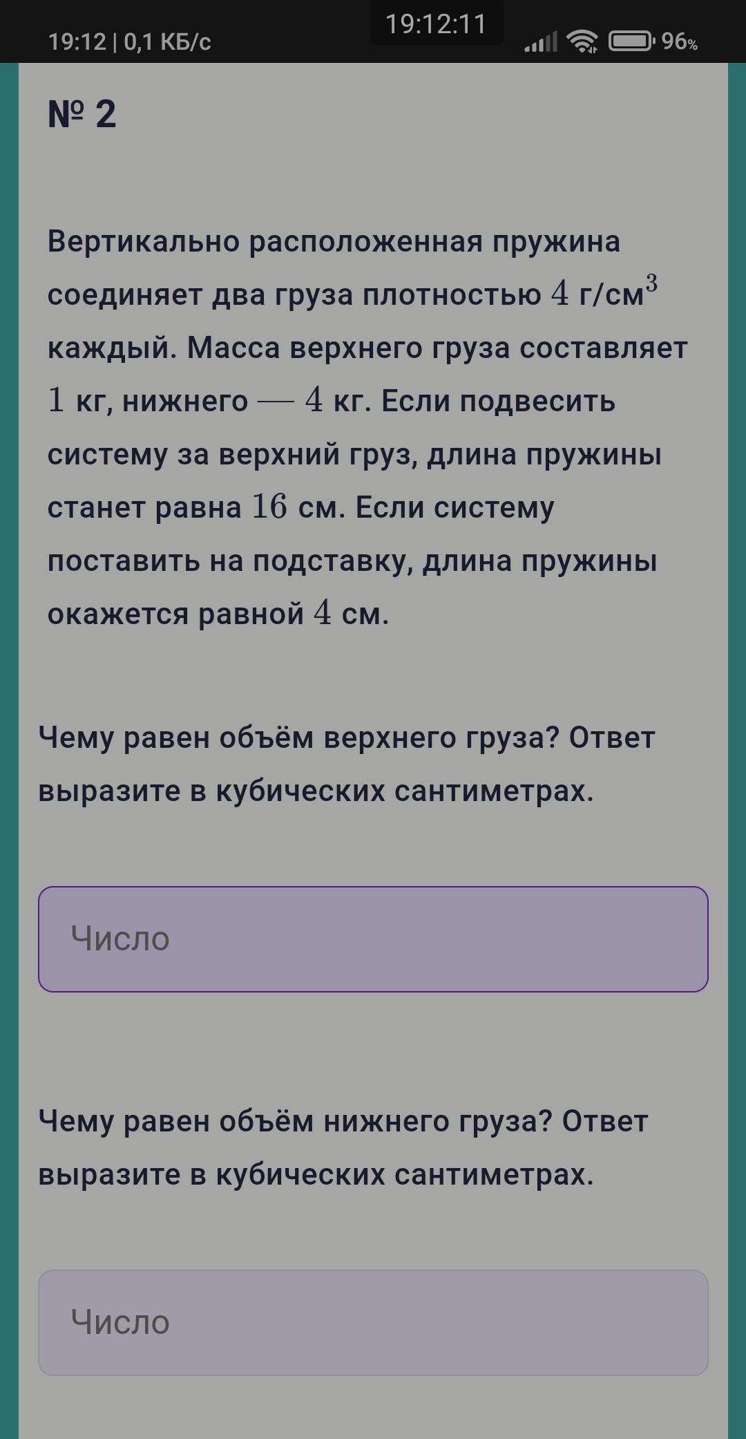 No 2 Вертикально расположенная пружина соединяет два груза плотностью 4 г/см3 каждый. Масса верхнего груза составляет 1 кг, нижнего 4 кг. Если подвесить систему за верхний груз, длина пружины станет равна 16 см. Если систему поставить на подставку, длина пружины окажется равной 4 см. Чему равен объём верхнего груза? Ответ выразите в кубических сантиметрах. Число Чему равен объём нижнего груза? Ответ выразите в кубических сантиметрах. Число