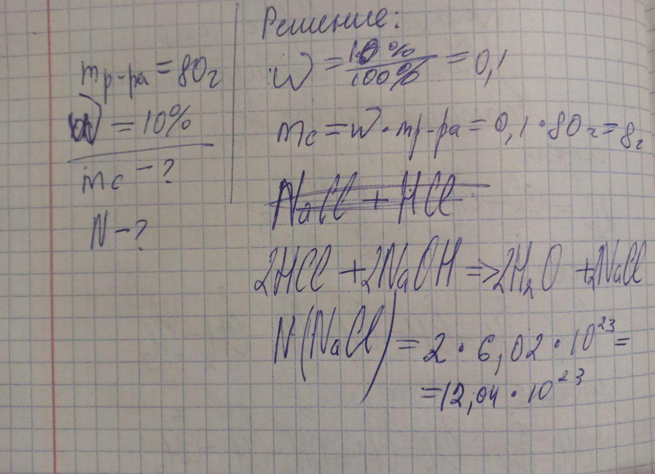 Определить массу и число молекул хлорида натрия, который образовался при взаимодействии соляной кислоты и раствора гидроксида натрия массой 80 г с массовой долей 10%
