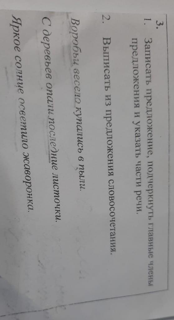 1. Записать предложение, подчеркнуть главные члены предложения и указать части речи. 2. Выписать из предложения словосочетания.