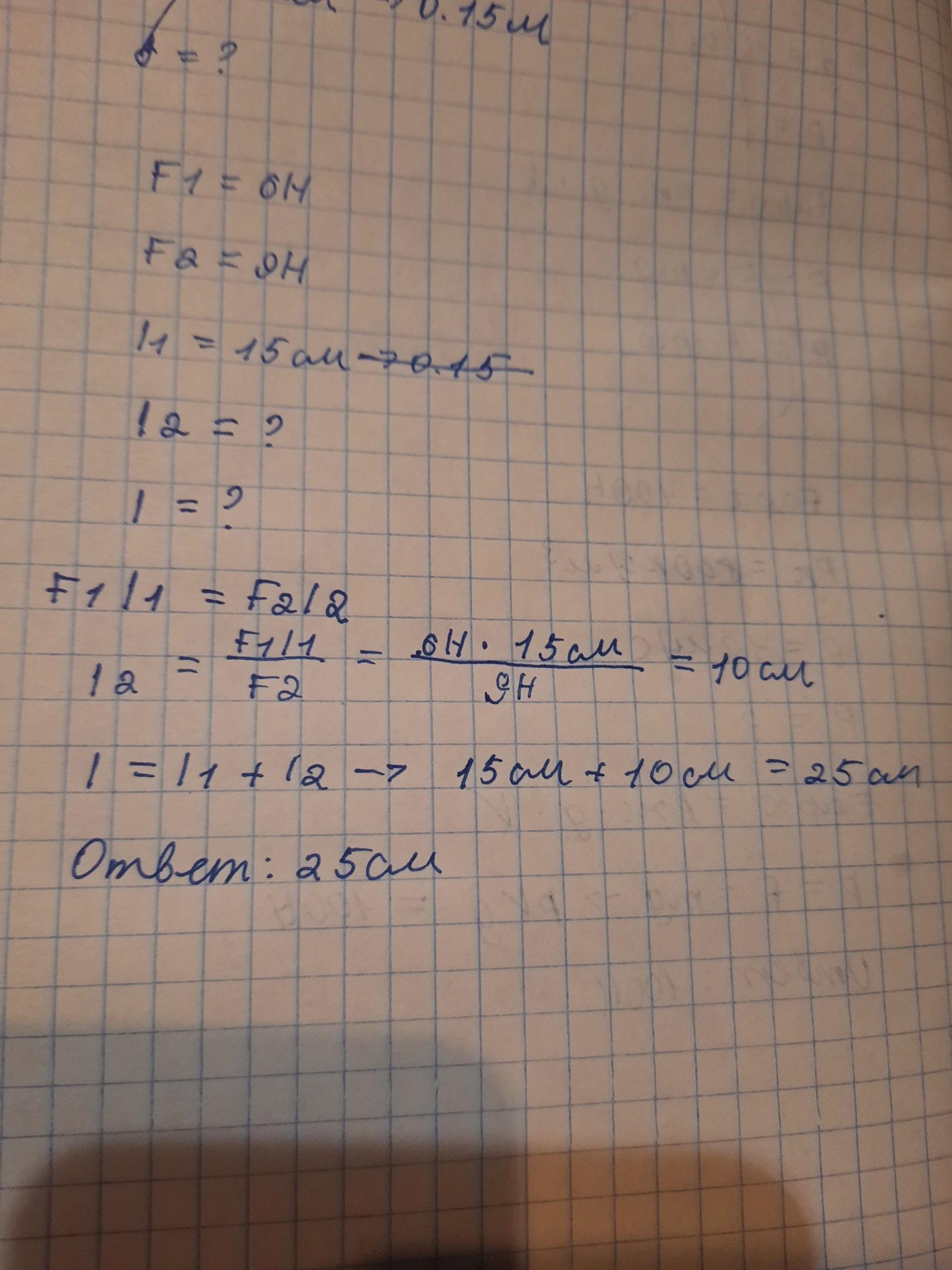 легкий рычаг AB находится в равновесии под действием двух сил. F1=6Н. чему равна длина рычага если плечо силы F1=15 см, а сила F2=9H