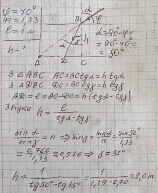 На дні річки лежить камінець. хлопчик на цілившись спрямовує на нього палицю під кутом 40 градусів до горизонту. яка глибина річки якщо палиться доторкнулися одна на відстані 1м від кам'янця?