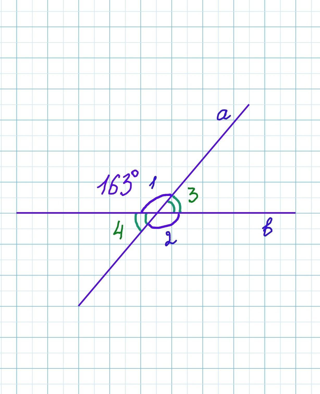 Так как вертикальные углы равны(свойство), то ∠2=∠1=163°,∠3=∠4.