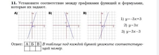 2) у=3х- это прямая пропорциональность. точка (0;0) обязательно принадлежит графику. видим соответствие графику А), но для пущей важности проверим еще одну точку. например (1;3) у=3*1=3 такая точка есть на графике и при подстановке в формулу тоже получаем верное равенство 3=3