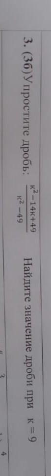 3. (36) Упростите дробь: К2-14к+49 к2 -49 Найдите значение дроби при к= 9