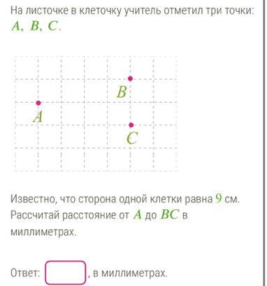 Проведем BC и перпендикуляр из точки A в середину BC. Посчитаем клетки, получим 4 кл. Сторона клетки равна 9 см, переводим сантименты в мм, получаем 90мм - 1 клетка.