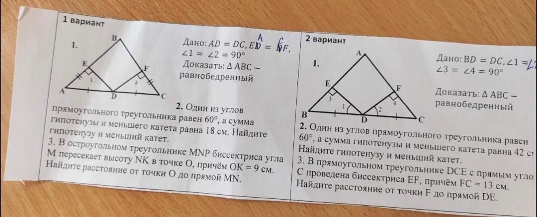 треугольники ADE и DFC равны по катету и гипотенузы, следовательно, углы A и С равны, значит треугольник АВС - равнобедренный.