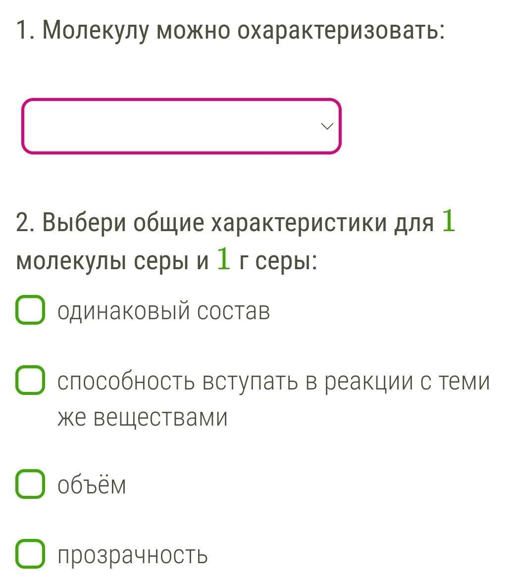 2. Выбери общие характеристики для 1 молекулы серы и 1 г серы: