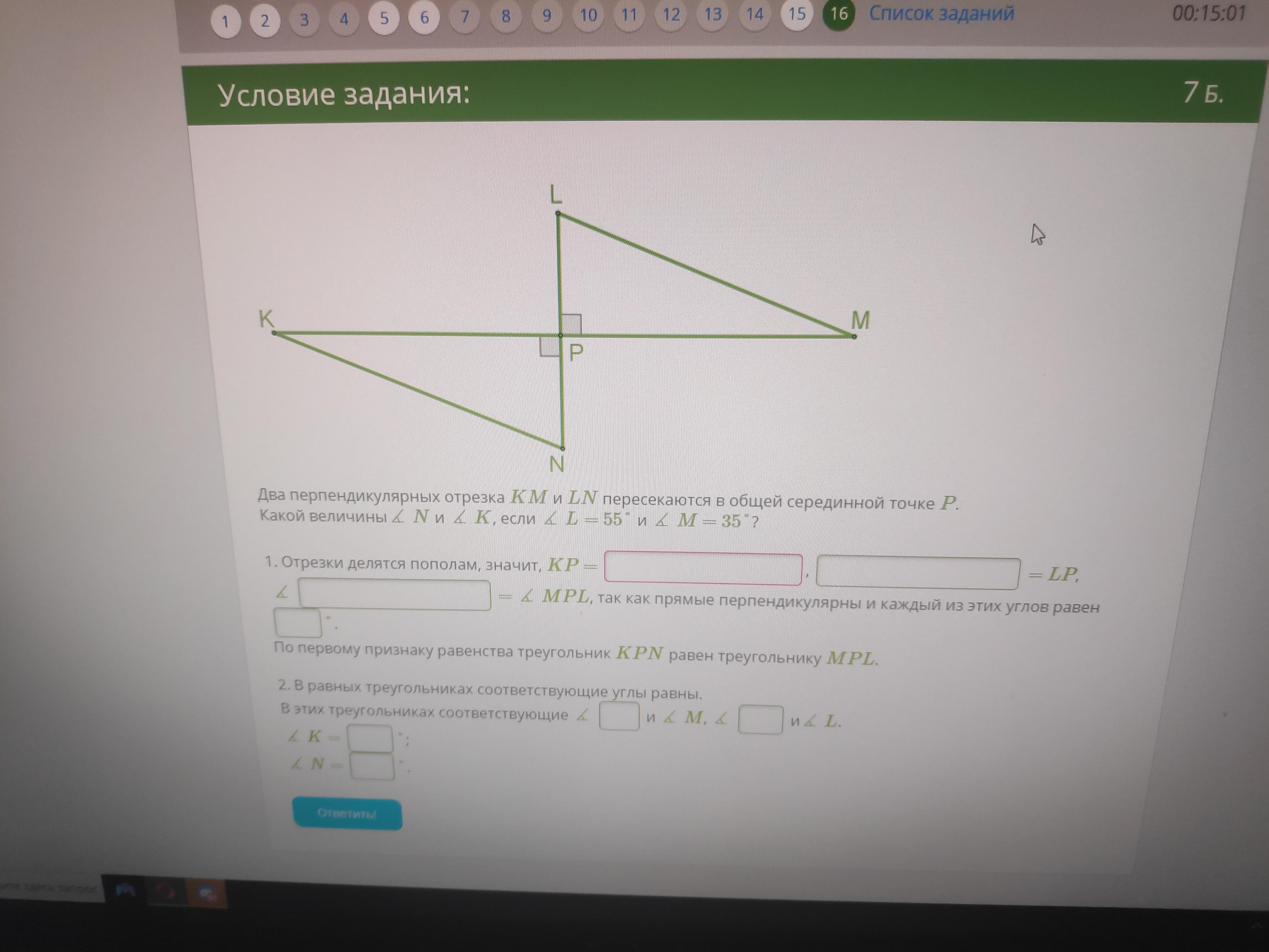 1. KP = PM, PN = LP, угол KPN = угол MPL, ... равен 90 градусов