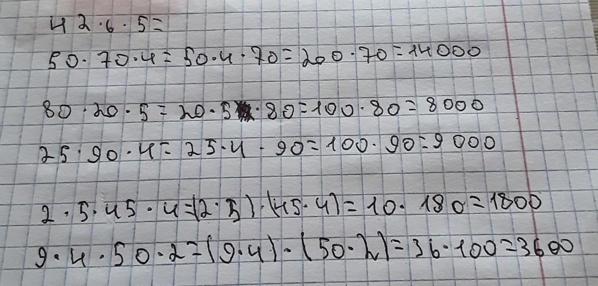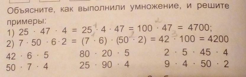 8 Объясните, как выполнили умножение, и решите примеры: 1) 25 · 47 · 4 = 254.47 = 100 · 47 = 4700; 2) 7.50 .6.2 = ( 76) · (50 - 2) = 42 - 100 = 4200 42 · 6 5 80 · 20 · 5 2 · 5 · 45 · 4 50 · 7.4 25 · 90 · 4 9 · 4 · 50 · 2 а >