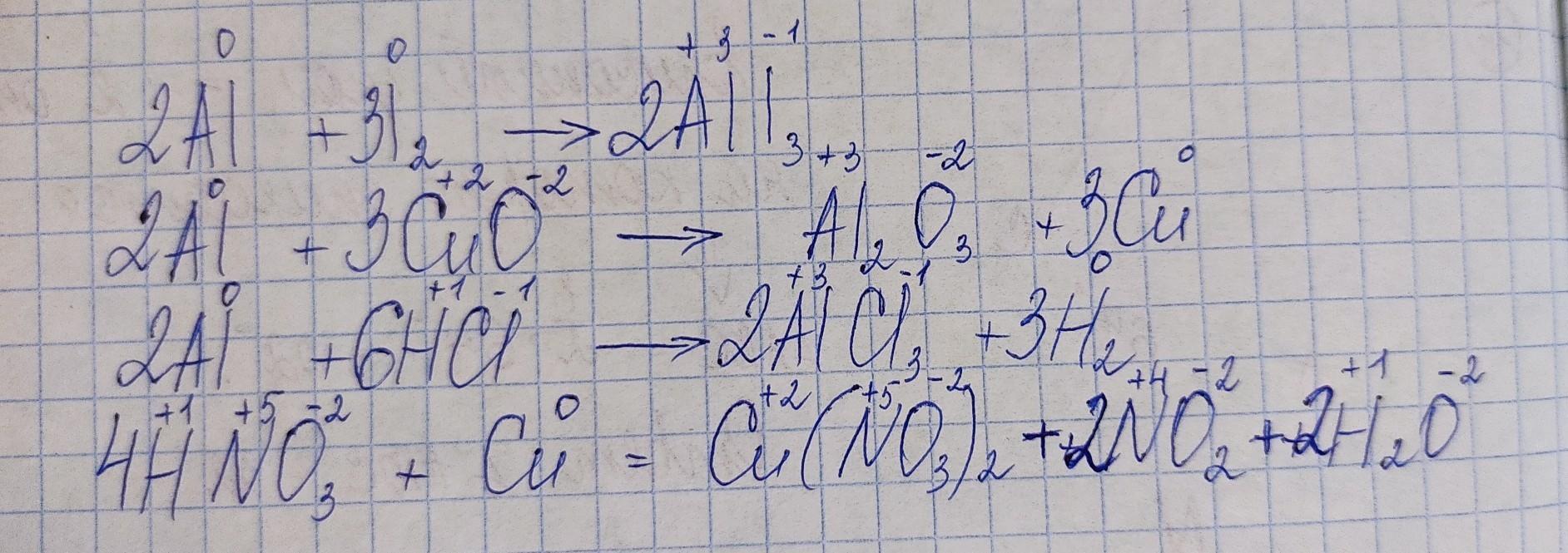 СРОЧНО!!! ДАЮ 30 БАЛЛОВ!!! Определите степень окисления каждого элемента, расставьте коэффициенты методом электронного баланса: Al + I2 → AlI3 Al + CuO → Al2O3 + Cu Al + HCl → AlCl3 + H2 *HNO3 + Cu → Cu(NO3)2 + NO2 + H2O Все цифры- это индексы, которые должны быть написаны подстрочным шрифтом .