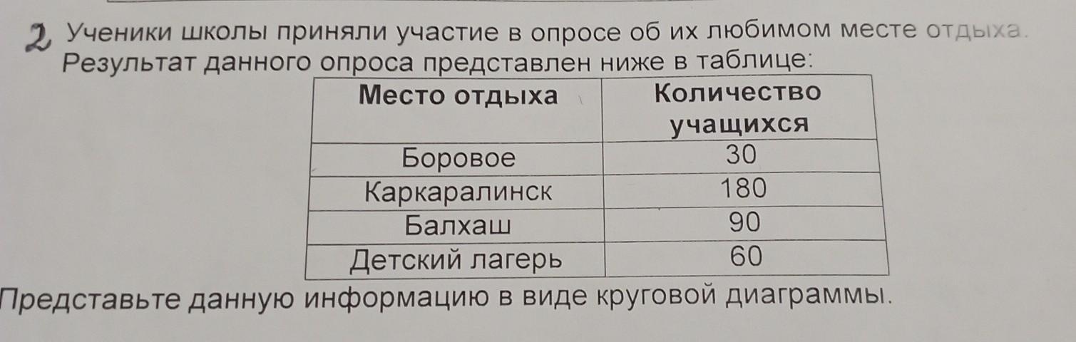 2 Ученики школы приняли участие в опросе об их любимом месте отдыха Результат данного опроса представлен ниже в таблице: Место отдыха Количество учащихся Боровое 30 Каркаралинск 180 Балхаш 90 Детский лагерь 60 Представьте данную информацию в виде круговой диаграммы.