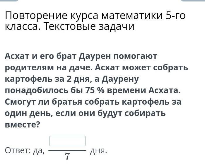 Асхат и его брат Даурен помогают родителям на даче. Асхат может собрать картофель за 2 дня, а Даурену понадобилось бы 75 % времени Асхата. Смогут ли братья собрать картофель за один день, если они будут собирать вместе?