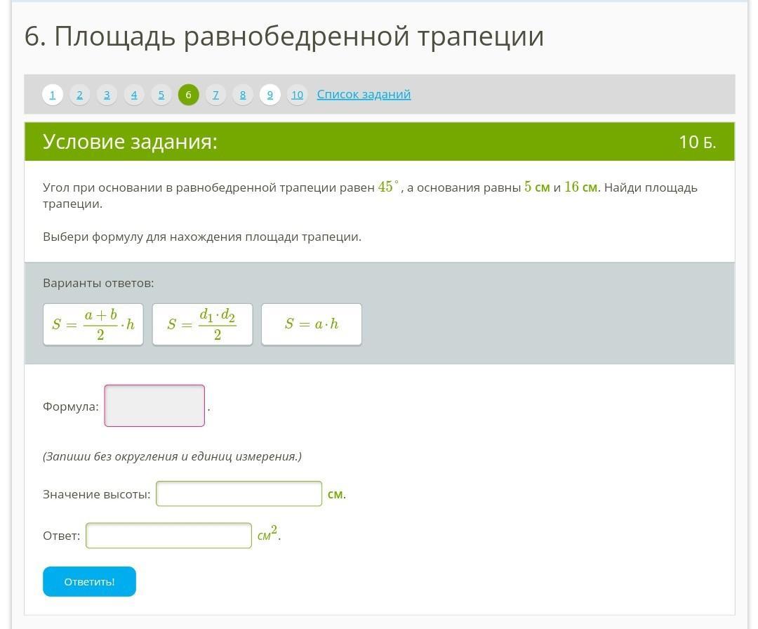 РЕШЕНИЕ: площадь трапеции (S) равна произведению полусуммы его оснований (a, b) на высоту (h): S=(a+b)•h