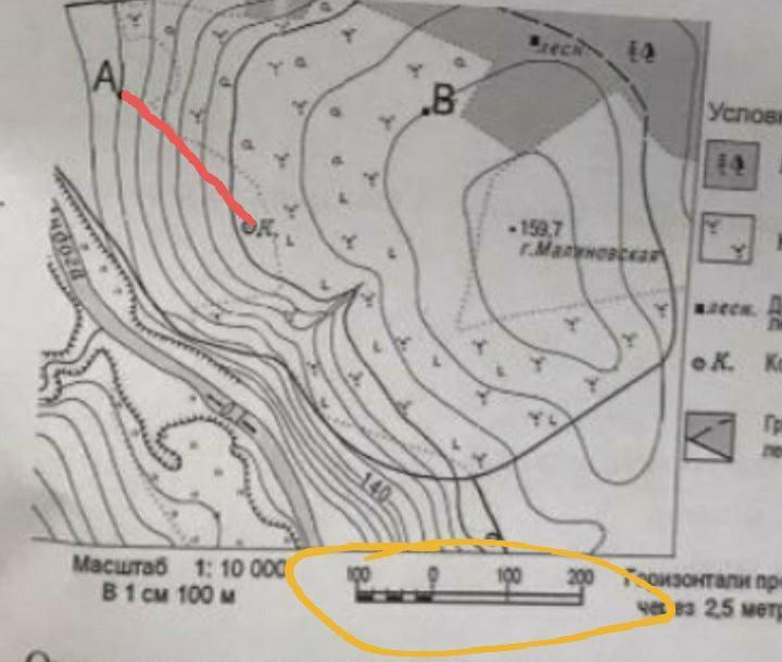 Чтобы найти расстояние необходимо провести прямую от точки А до кружочка с буквой К (конец линии находится ровно в середине кружка). Далее нужно взять линейку и приложить её к шкале, которая даётся вместе с топографической картой (оранжевый кружок), чтобы проверить, совпадает ли у вас масштабы. (Просто при печате они часто съезжают). Если деления не соответствуют вашей линейке, то советую взять бумажку и самим начертить новую линейку по данным делением, и тогда уже измерить расстояние по прямой.