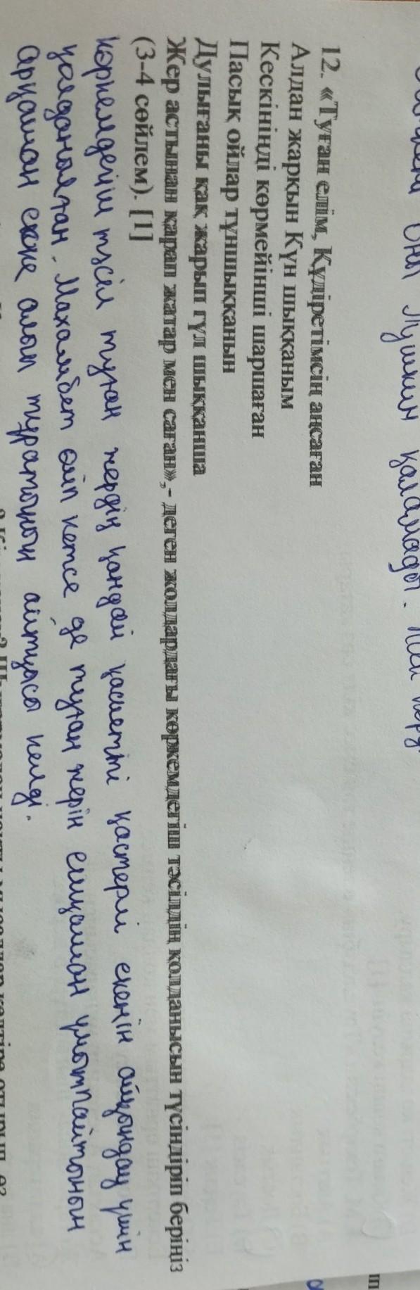 12. «Туған елім, Құдіретімсің ансаган Алдан жарқын Күн шыкканым Кескініңді көрмейінші шаршаған Пасық ойлар тұншыққанын Дулығаны қақ жарып гүл шыкканша Жер астынан қарап жатар мен саған»,- деген жолдардағы көркемдегіш тәсілдің қолданысын түсіндіріп беріңіз (3-4 сөйлем). [1]