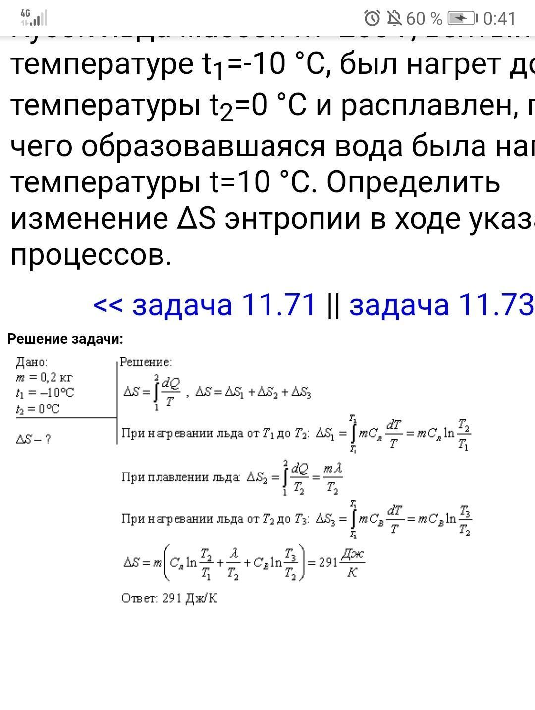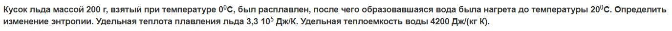 Кусок льда массой 200 г, взятый при температуре 0 С, был расплавлен, после чего образовавшаяся вода была нагрета до температуры 20 С. Определить изменение энтропии. Удельная теплота плавления льда 3,3х105 Дж/К. Удельная теплоемкость воды 4200 Дж/(кг К).