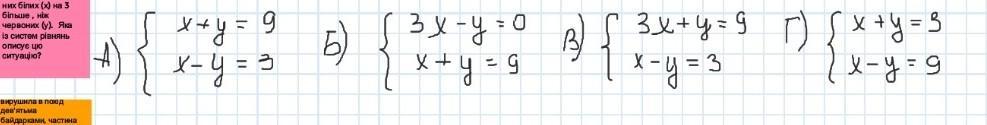 У вазі 9 троянд, iз них бiлих (x) на 3 більше, ніж червоних (у). Яка Із систем рiвнянь описує цю ситуацію?