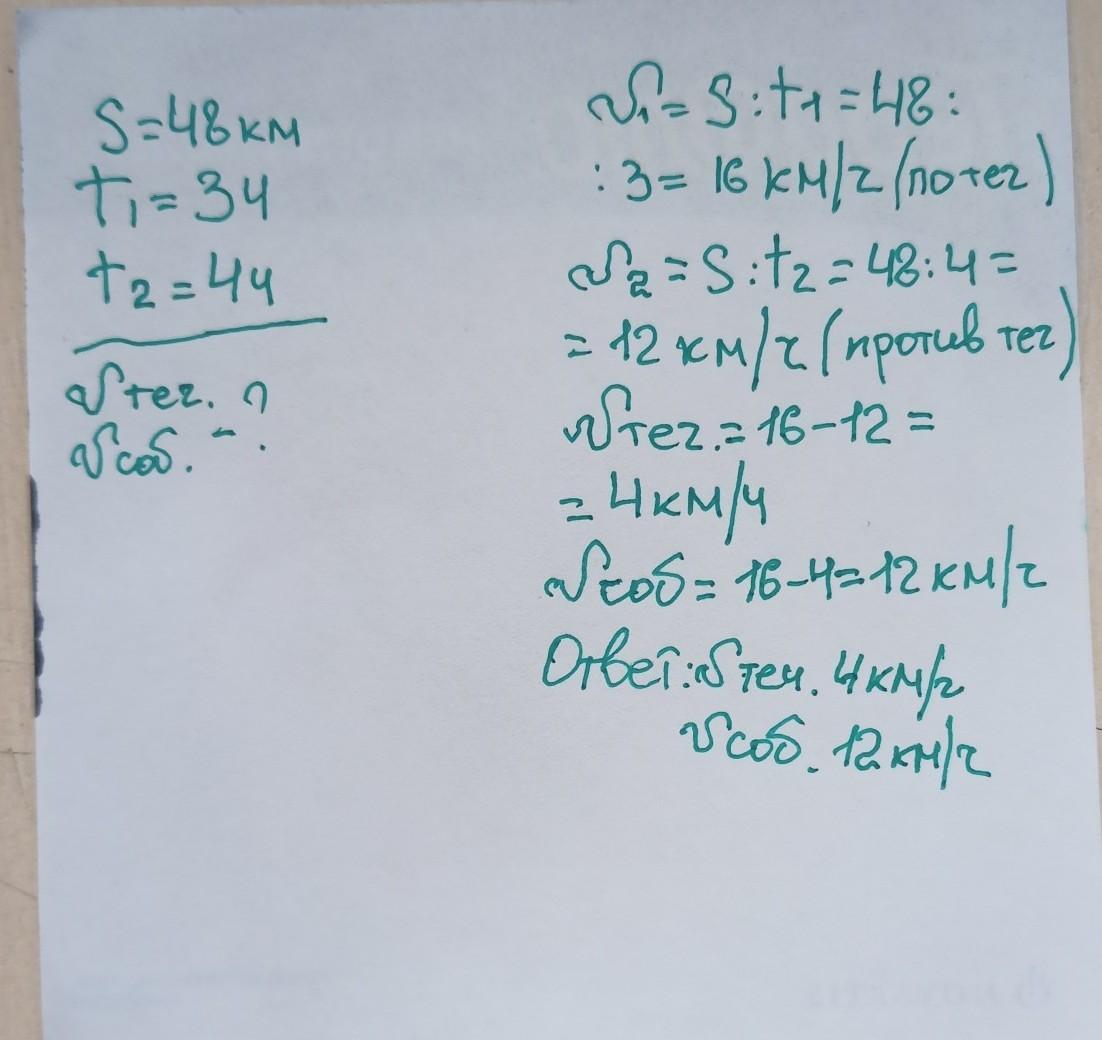 Катер проплыл по течению реки 48 км, затратив на весь путь 3 часа, на обратный путь затратил 4 часа, проплыв это же расстояние. Найди собственную скорость катера и скорость течения реки. Ответ: собственная скорость катера —км/ч; скорость течения реки —км/ч. Назад Проверить