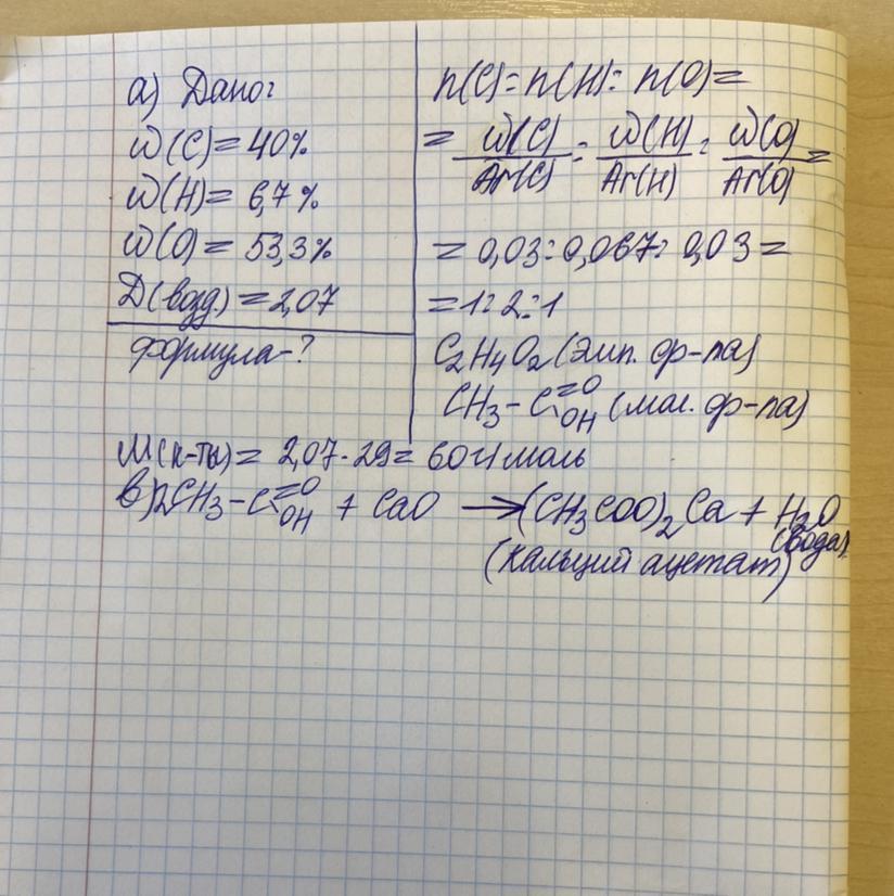 4. а) Анализ органической кислоты, выделенной из продуктов жизнедеятельности растительного организма, показывает, что она содержит 40% углерода, 6,7% водорода и 53,3% кислорода. Относительная плотность воздуху равна 2,07. Определите эмпирическую и молекулярную формулу для этой кислоты.