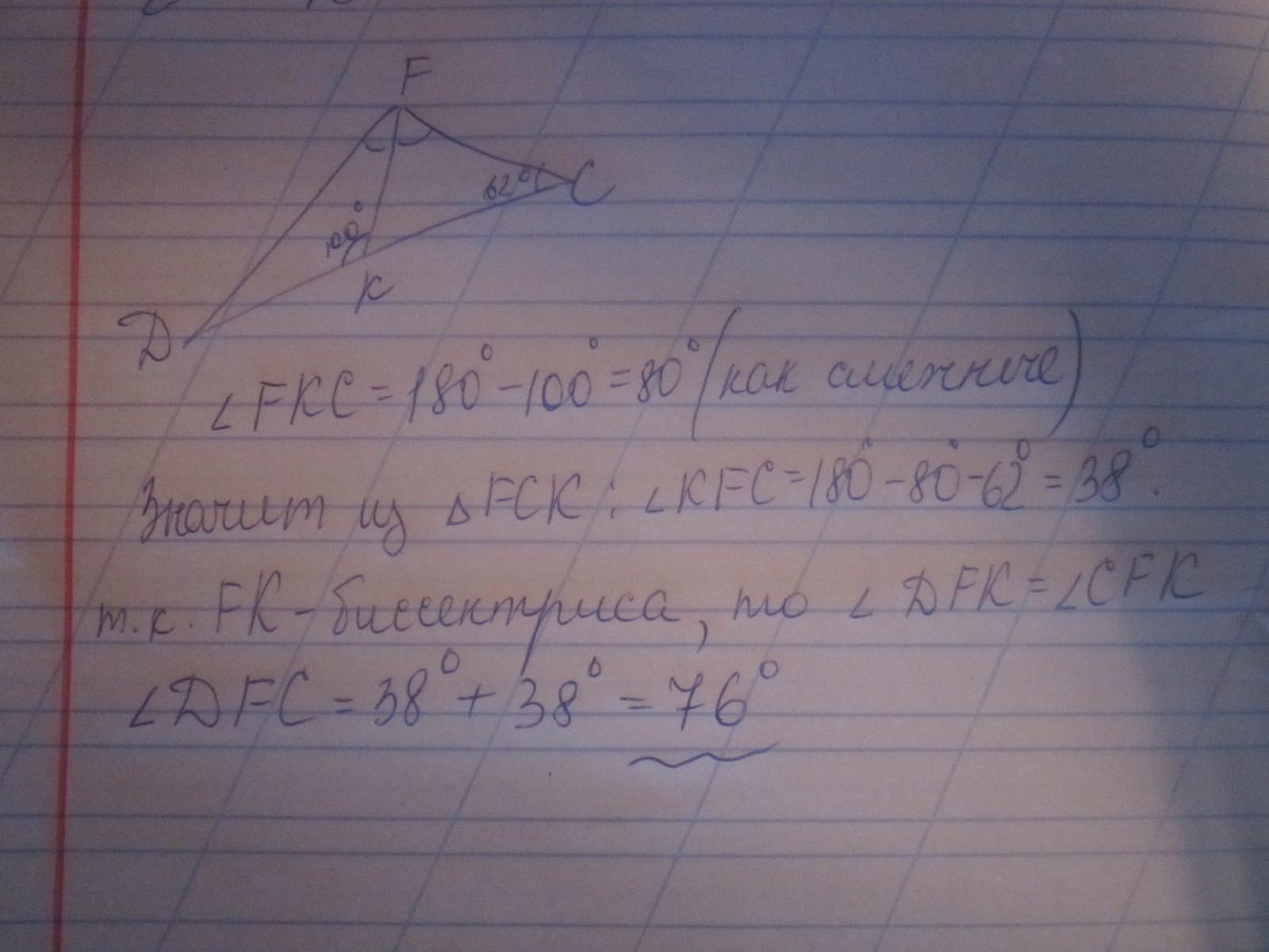 в треугольнике DFC известно, что С = 62. Биссектриса угла F пересекает сторону DC в точке К, FKD = 100. Найдите угол DFC.
