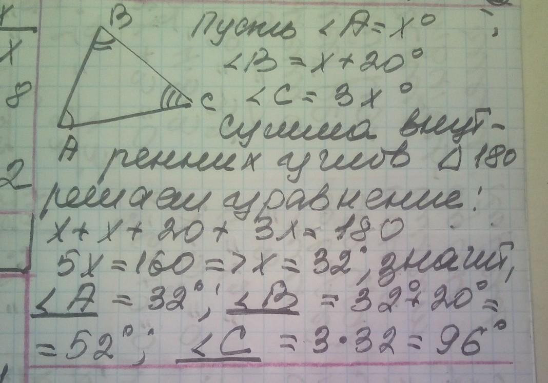 Найдите углы треугольника АВС,если угол А на 20 градусов меньше,чем угол В,и в 3 раза меньше чем угол С