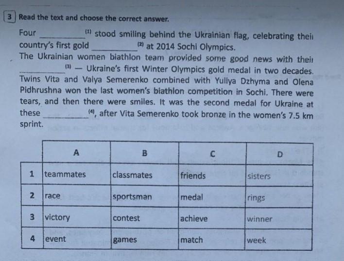 3 Read the text and choose the correct answer. Four (1) stood smiling behind the Ukrainian flag, celebrating theii country's first gold (2) at 2014 Sochi Olympics. The Ukrainian women biathlon team provided some good news with their (3) Ukraine's first Winter Olympics gold medal in two decades. Twins Vita and Valya Semerenko combined with Yuliya Dzhyma and Olena Pidhrushna won the last women's biathlon competition in Sochi. There were tears, and then there were smiles. It was the second medal for Ukraine at these (4), after Vita Semerenko took bronze in the women's 7.5 km sprint. А B с D 1 teammates classmates friends sisters N race sportsman medal rings 3 victory contest achieve winner 4 event games match week