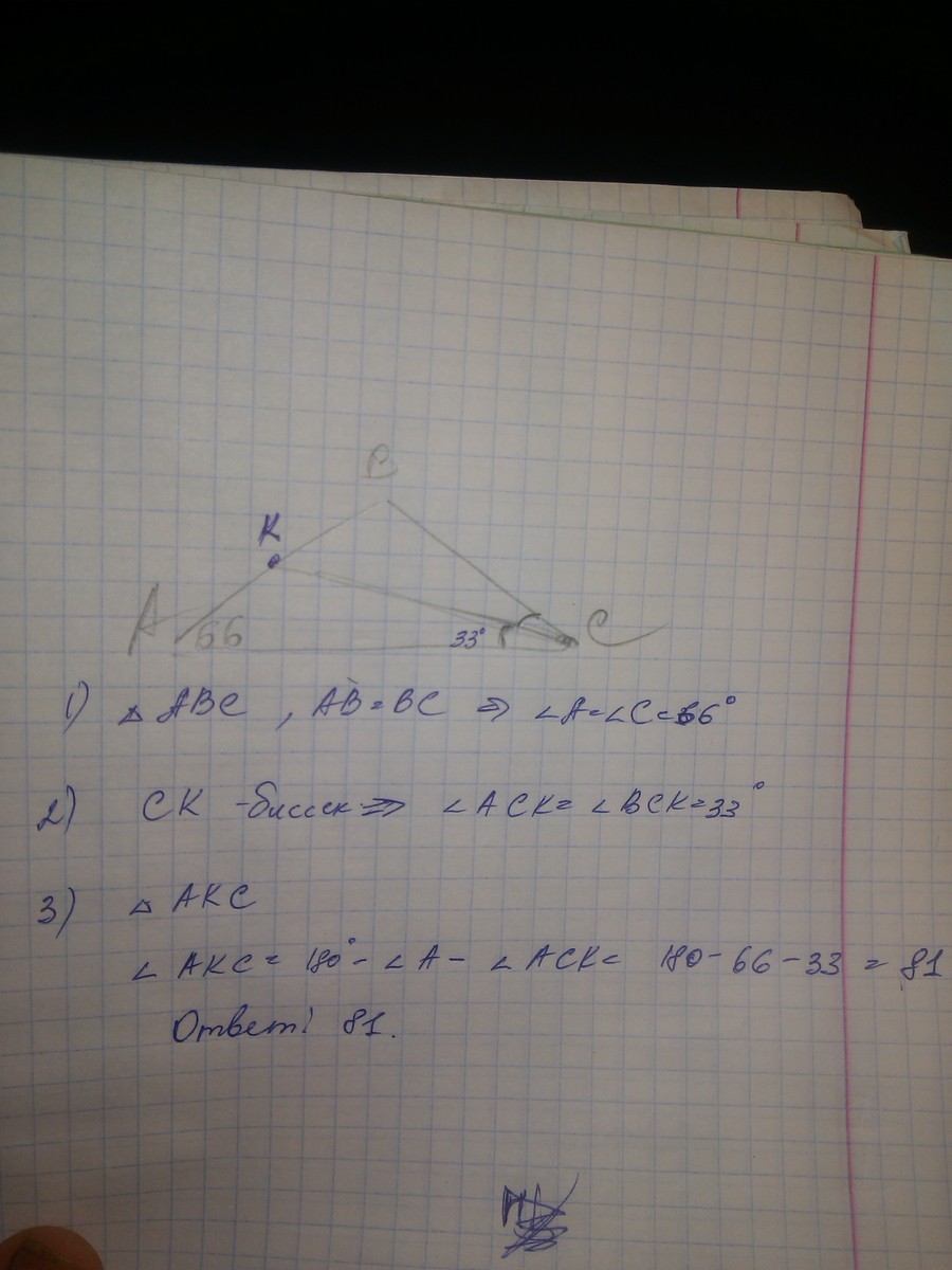 Помогите пожалуйста .в треугольнике ABC известно , что AB=BC , СК-биссектриса, угол A=66 градусов. найдите угол AKC