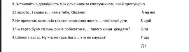 ДОПОЖІТЬ!!!! ЗАВДАННЯ З КР!! Установіть відповідність між реченням та сполучником, який пропущено