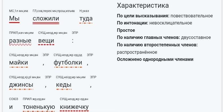 синтаксический разбор предложения: Мы сложили туда разные вещи: майки, футболки, джинсы, кеды, и тоненькую книжечку "Угрожает ли Солнечной системе тепловая смерть"