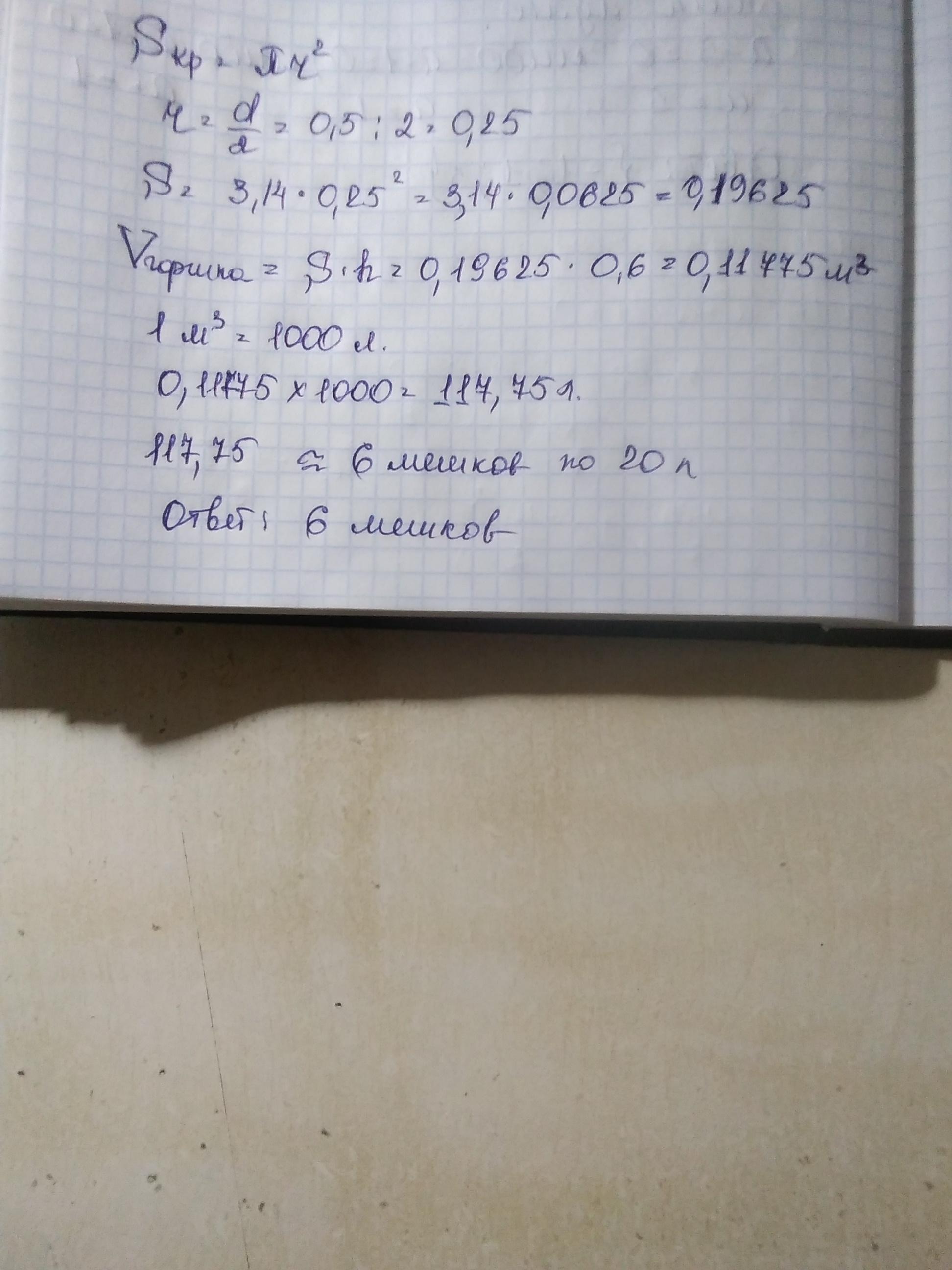 5 Цилиндрический горшок для растений должен быть заполнен почвой. Он имеет внутренний диаметр 0,50 м и высоту 0,60 м. Вам нужны 20-литровые мешки с грунтом, сколько вам нужно чтобы заполнить горшок?