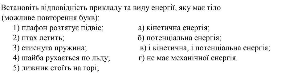Встановіть відповідність прикладу та виду енергії, яку має тіло (можливе повторення букв): 1) плафон розтягує підвіс; а) кінетична енергія; 2) птах летить; б) потенціальна енергія; 3) стиснута пружина; в) і кінетична, і потенціальна енергія; i 4) шайба рухається по льду; г) не має механічної енергія. 5) лижник стоїть на горі;
