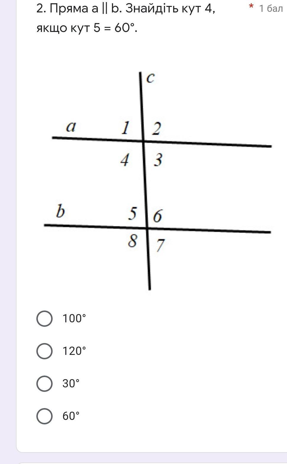 120 градсів = 6 кут. 6 кут = 4 куту як кути через січну і дві паралельні прямі